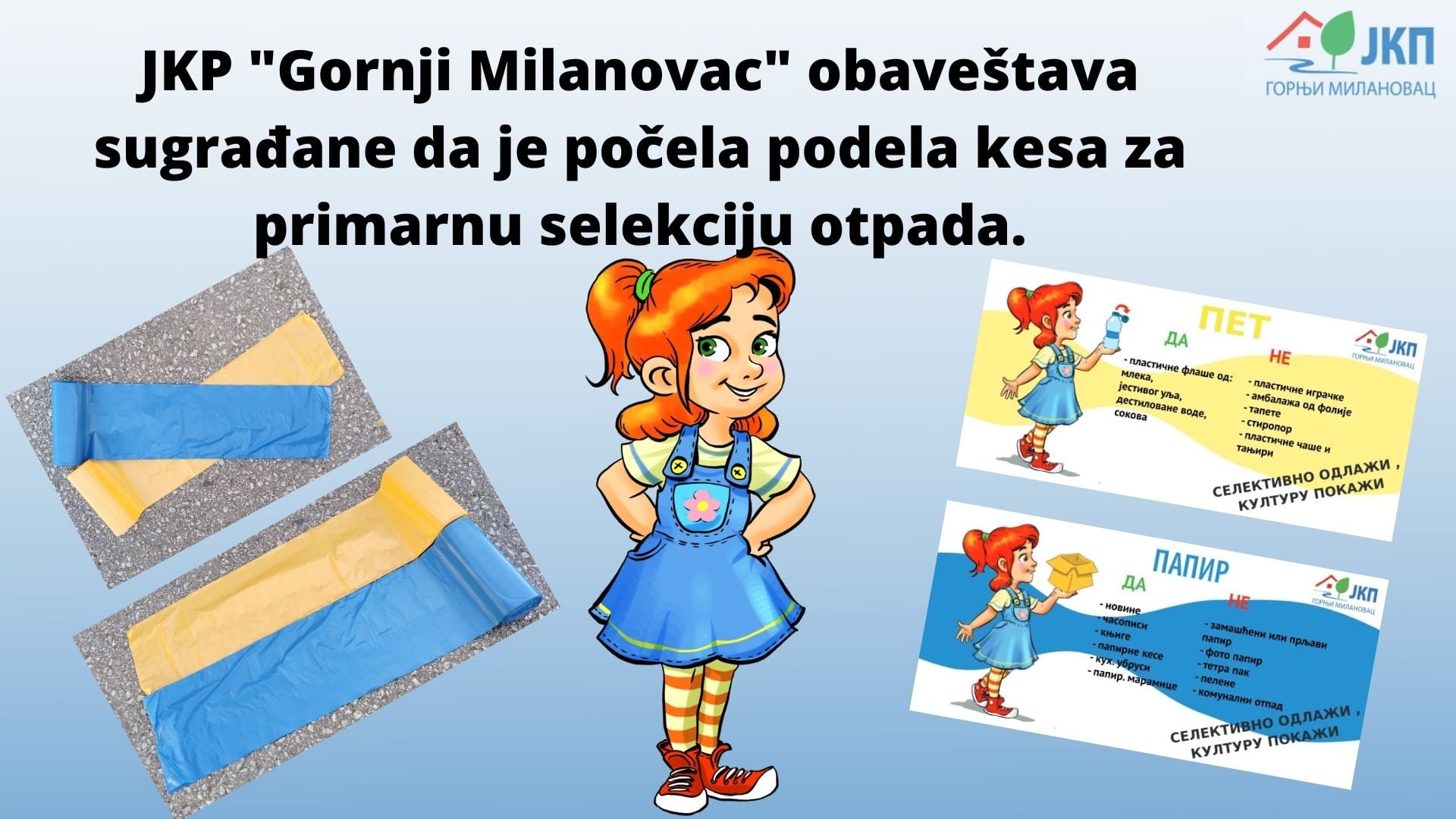 Stalno obaveštavaju građane da u plave kese odlažu papir i karton, a u žute pet ambalažu, uz podsećanje da je zaštita životne sredine zajednički posao, ali da svaki pojedinac treba da da svoj doprinos.