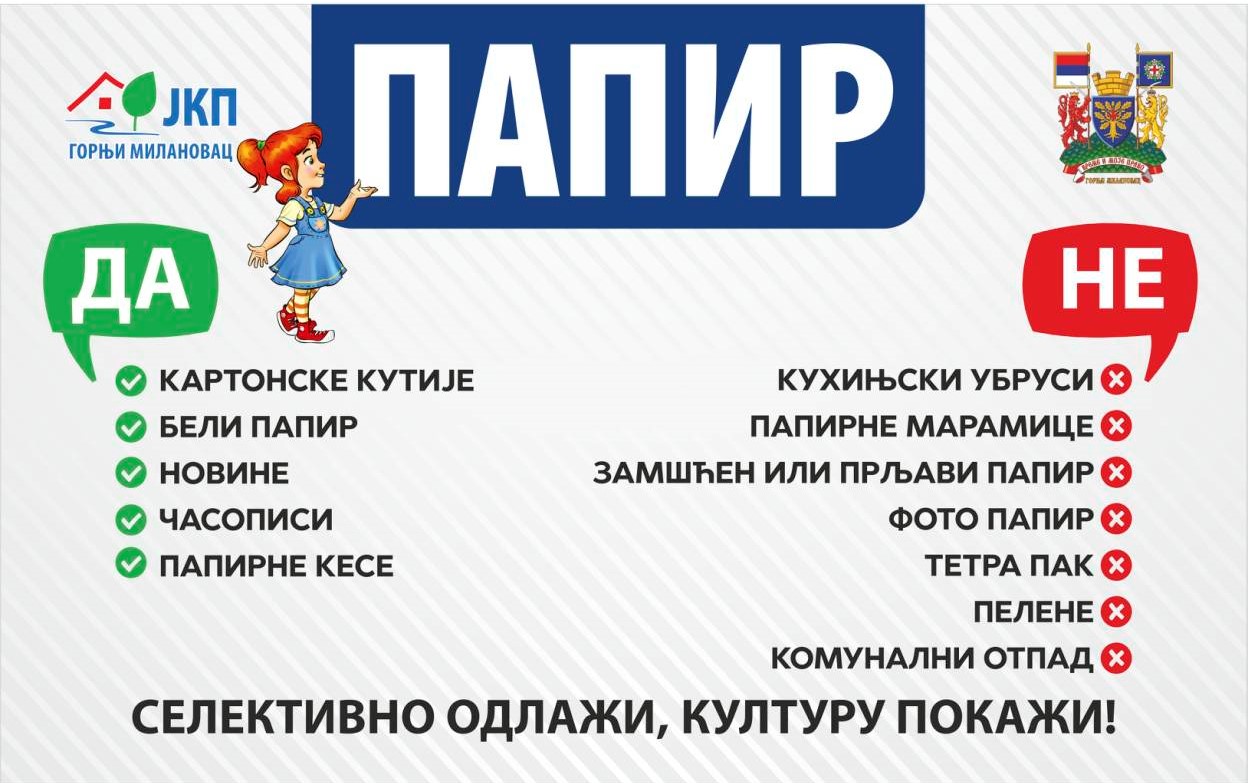 Selektivno razvrstavanje otpada je deo kulture i način ophođenja prema prirodnom okruženju. Uz to omogućava prikupljanje sekundarnih sirovina koje se mogu reciklirati, odnosno ponovo iskoristiti. Uz smanjene količine otpada na deponijama štede se materijali neophodni za proizvodnju ambalaže, ali se štede voda i energija kao prirodni resursi. U praksi građani često u iste kese stavljaju kartonske kuhinje i kuhinjske ubruse, papirne maramice ili prljavi papir kome tu nije mesto. Zato iz JKP Gornji Milanovac stalno podsećaju gde koji otpad treba da završi.